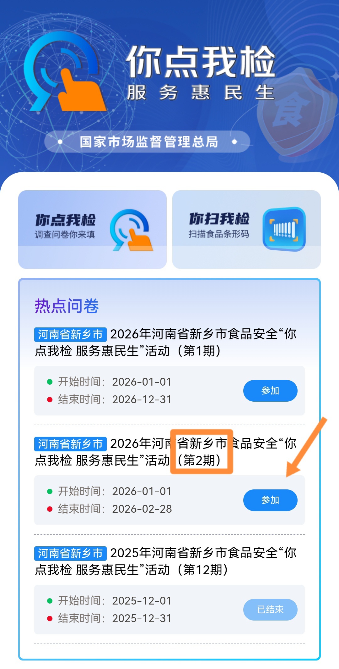 *2026年“你点我检”春节专项活动(2026.1.1-2.28) 如图,选择《2026年河南省新乡市食品安全“你点我检 服务惠民生”活动(第2期)》,对相关项目进行点选。 |